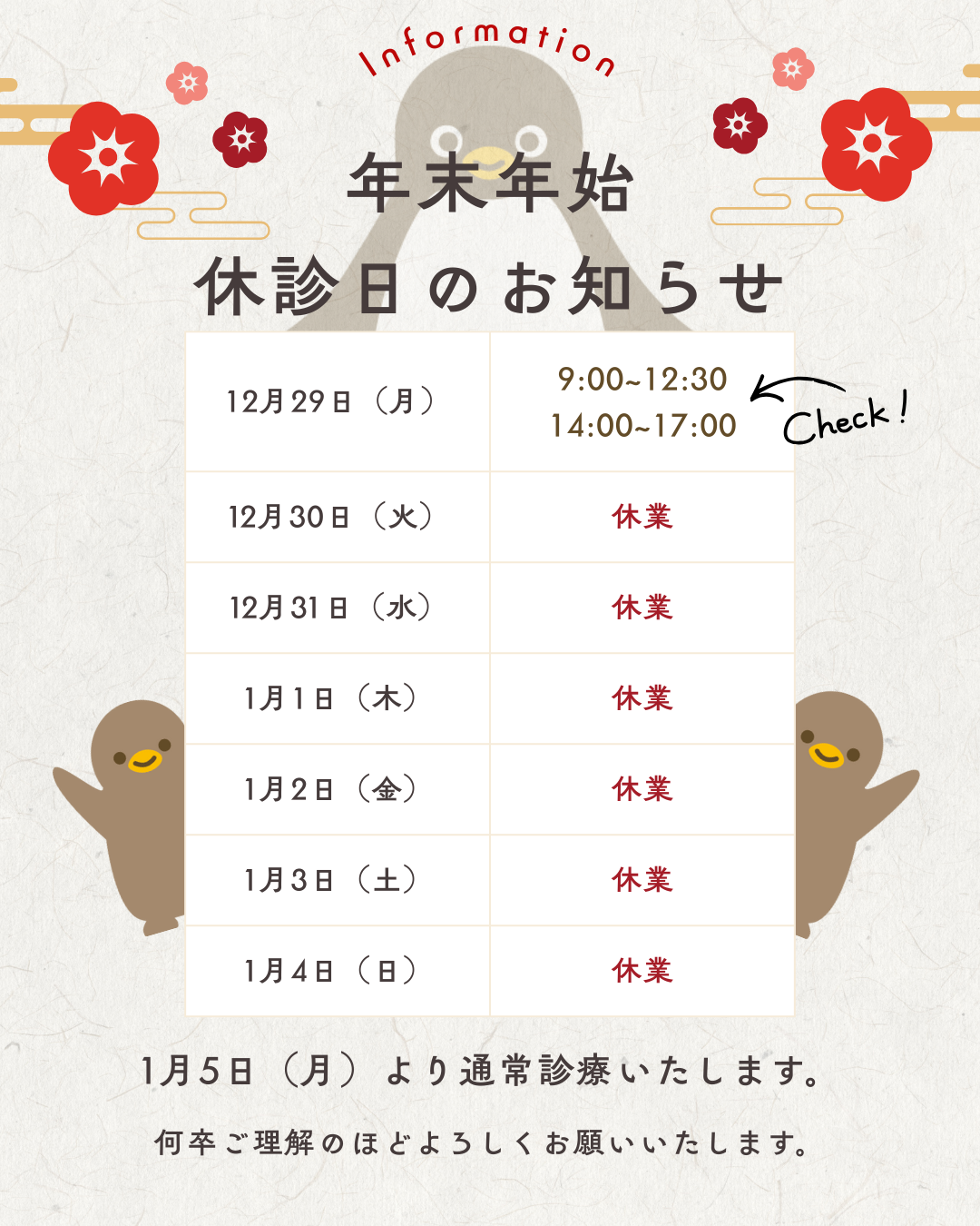 📌 1/5(月)から通常どおり診療しますなお、12月29日(月)は午前は通常通り、午後は「14:00〜17:00」の時間帯で一般診療を行います。