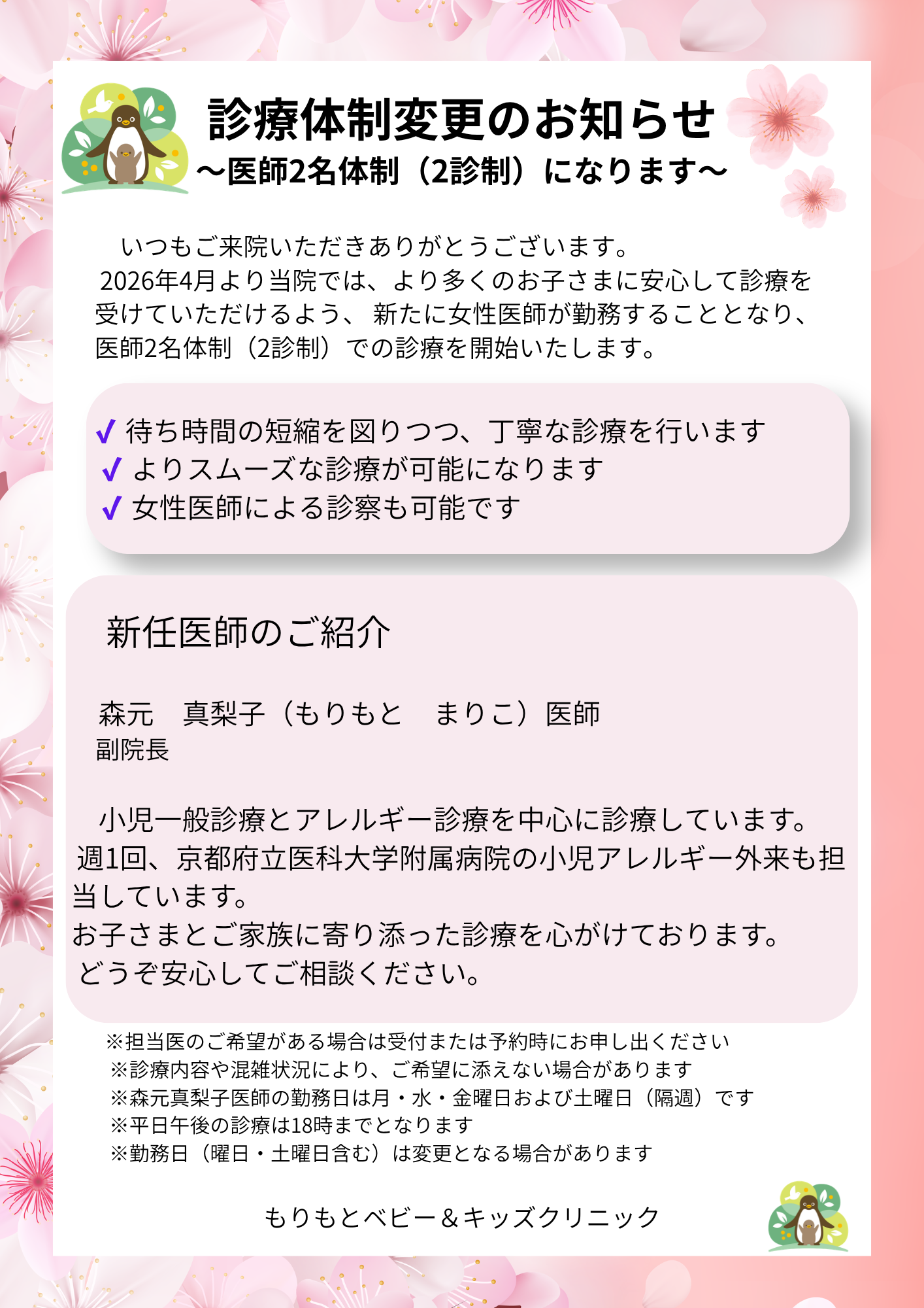 🟣診療体制変更のお知らせ(2026年4月〜医師2名体制になります)